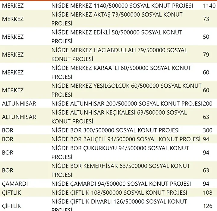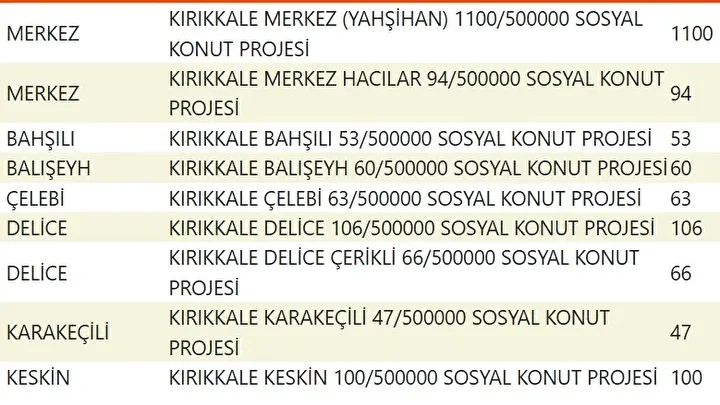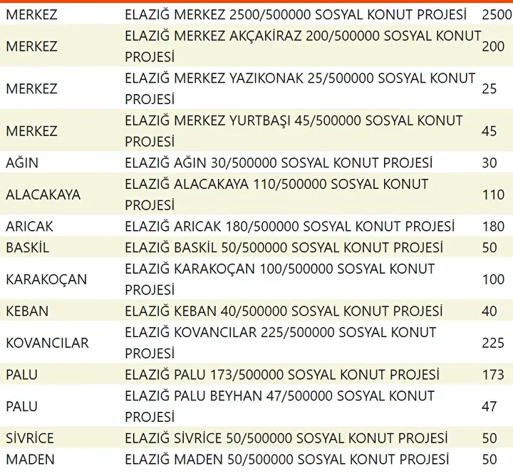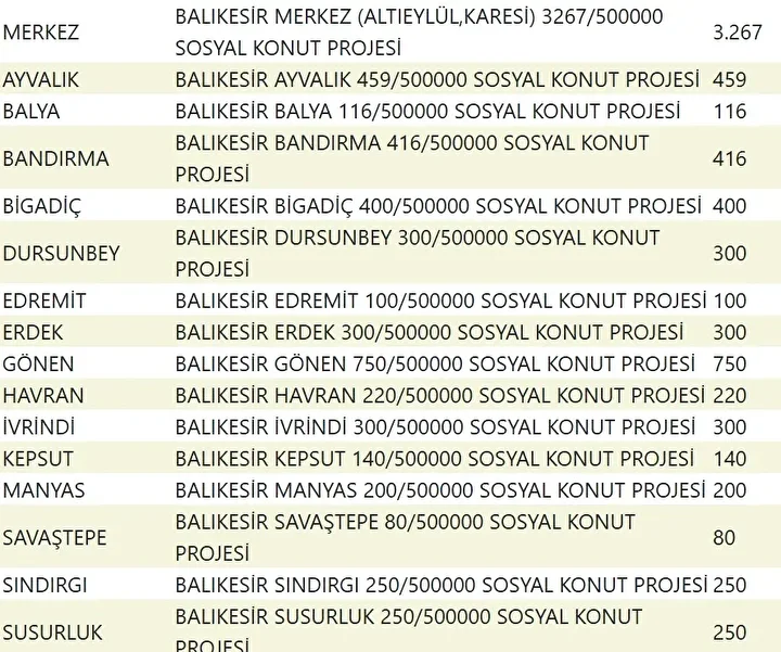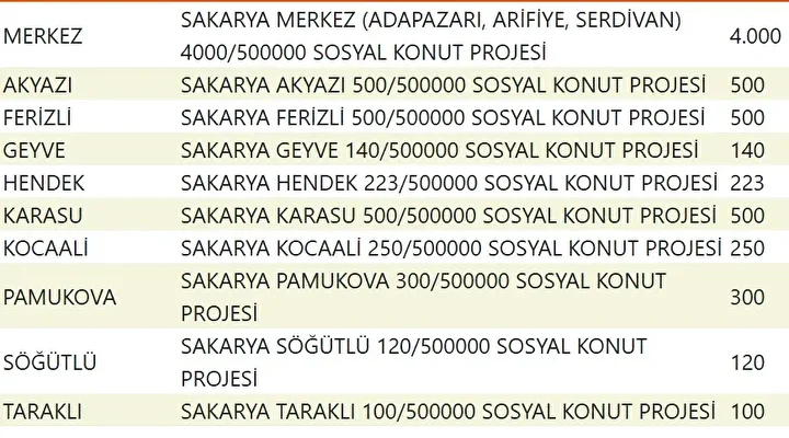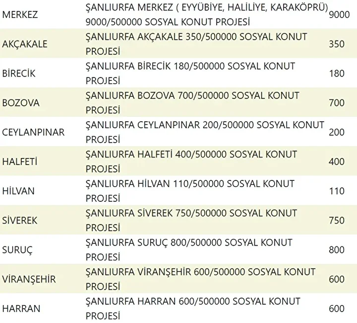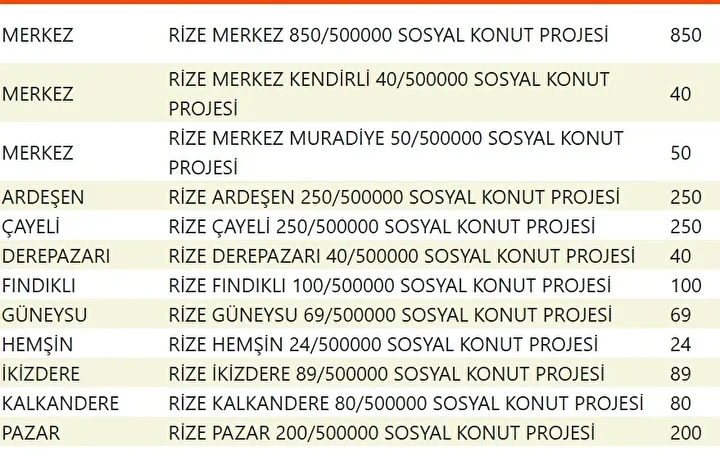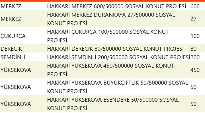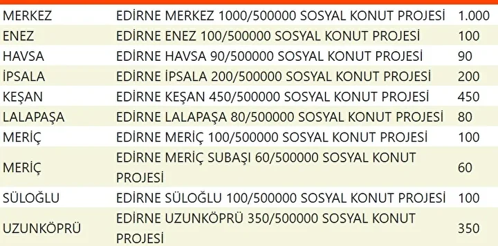 Projede en fazla konutun yapılacağı iller İstanbul, Ankara, İzmir, Bursa ve Konya olarak kayıtlara geçti. Bu doğrultuda 81 ilde 500 bin konutun yükseleceği ilçeler de netleşti.