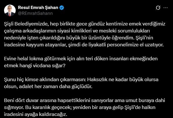 Yaklaşık 8 aydır Silivri’deki Marmara Cezaevi’nde tutuklu bulunan seçilmiş Şişli Belediye Başkanı Resul Emrah Şahan da işten çıkarmalara sosyal medya hesabı üzerinden tepki gösterdi. Şahan, paylaşımında şu ifadeleri kullandı: